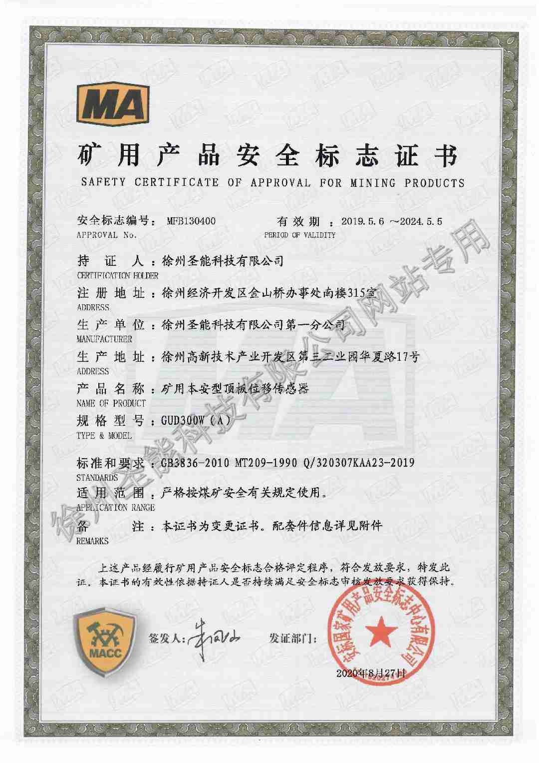 GUD300W(A)矿用本安型顶板位移传感器防爆证