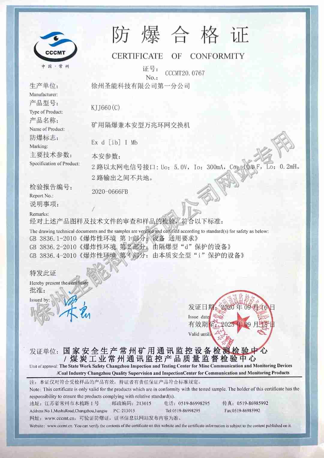 KJJ660(B)矿用隔爆兼本安型万兆环网交换机防爆证