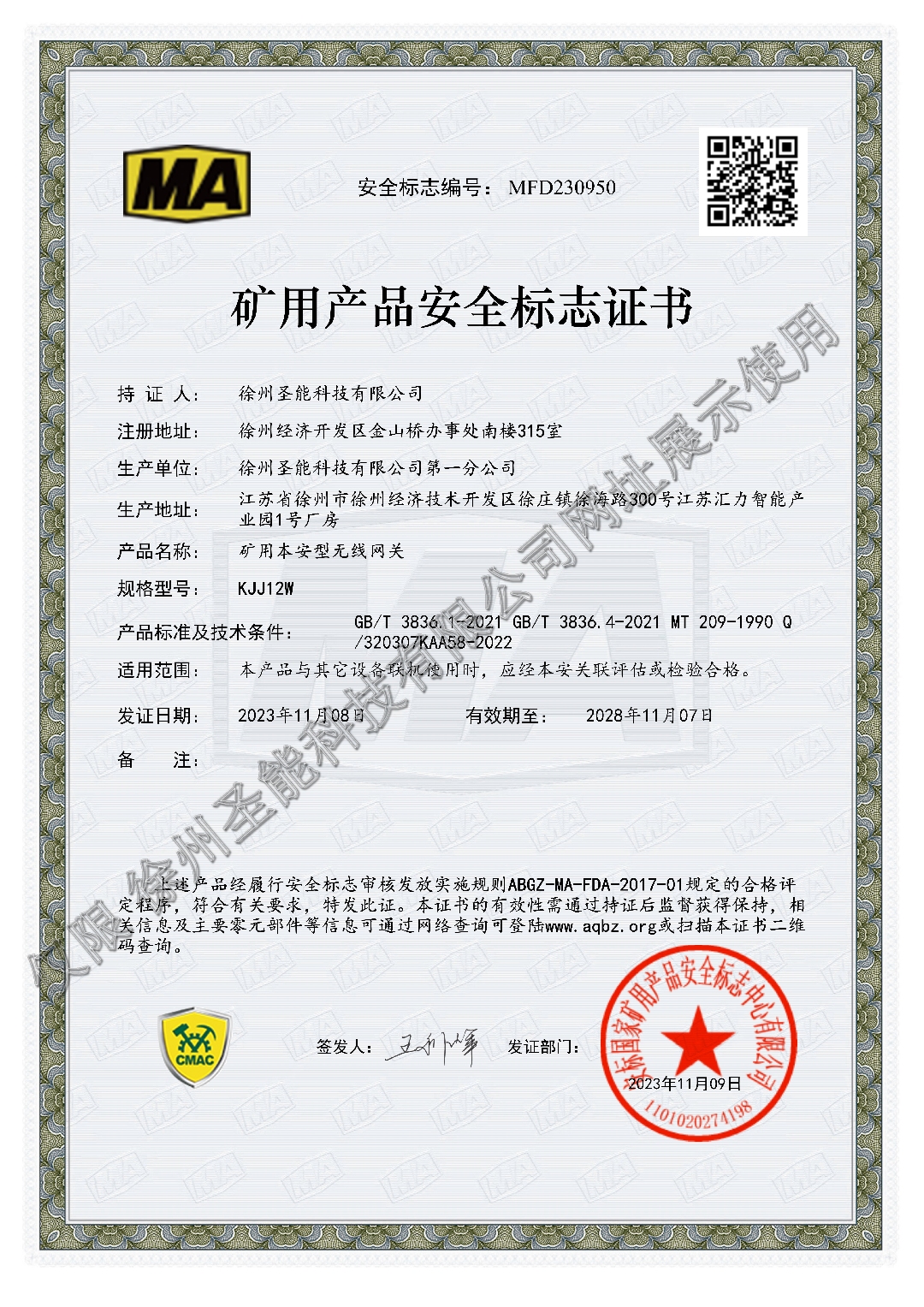 KJJ12W矿用本安型无线网关安标证