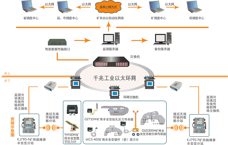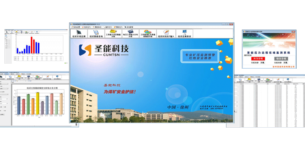该系统主要由KJ453矿用隔爆兼本安型分站、YHY60W(A)矿用本安型数字压力计、GUD300W(A)矿用本安型顶板位移传感器、MCS-40(A)0矿用本安型锚杆(索)测力计、GZY25W矿用本安型钻孔应力传感器、GUD2000W(A)矿用本安型液压支架活柱缩量传感器以及《煤矿压力监测系统》软件等几部分组成。