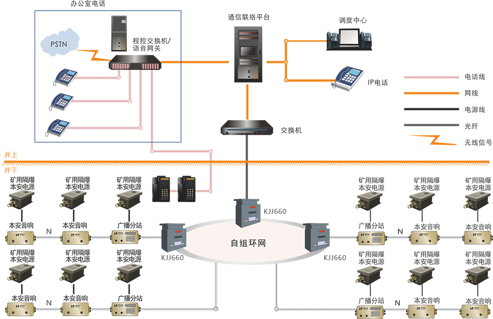 矿用应急救援语音广播系统是一套基于先进的IPPBX软交换平台的广播调度系统,互通性强,扩展性能好,而传统的PBX含有各个厂家的专用技术,产品之间互通性、兼容性较差。本系统主要将地面调度中心的紧急实时广播、背景音乐和宣传教育等音频内容广播到井下大巷、停车场、休息室、采掘工作面等场所,为井下工人提供音乐与安全知识教育以及紧急情况下的安全疏散撤离通知,同时实现生产场所与地面调度室对讲。井下可添加防爆电话,地面融合现有的电话系统,接入电话运营商网络,实现互相拨打的功能。