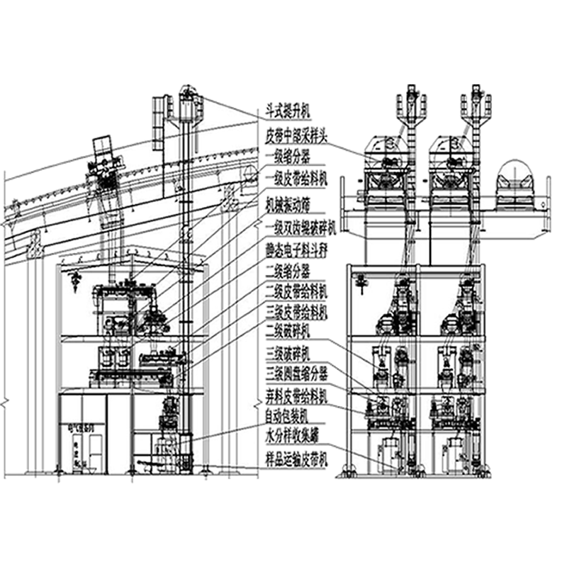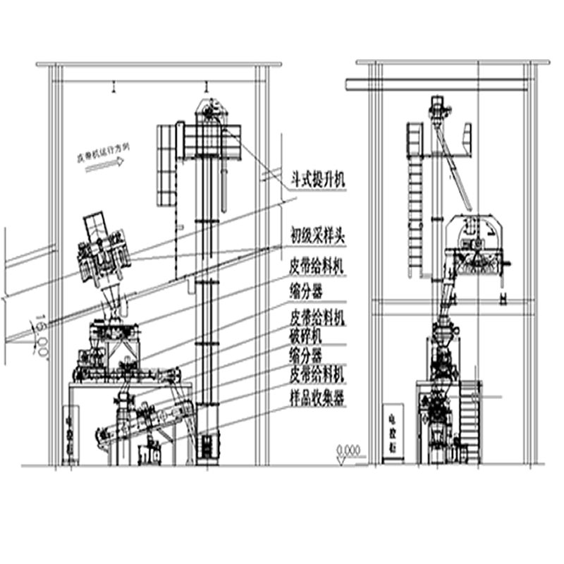 初级采样头安装在皮带机头部落料处,移动斗式头部采样头对物料抛物线截面的物料进行全断面截取,所取物料通过落煤管到初级给料机,进入破碎机、缩分器进行破碎缩分,缩分出的样品经落煤管到收集器收集,样品用于化验室水分样和成分样的测定,缩分器的弃料经余煤回送装置或落煤管回到正在运行的下级皮带机上。